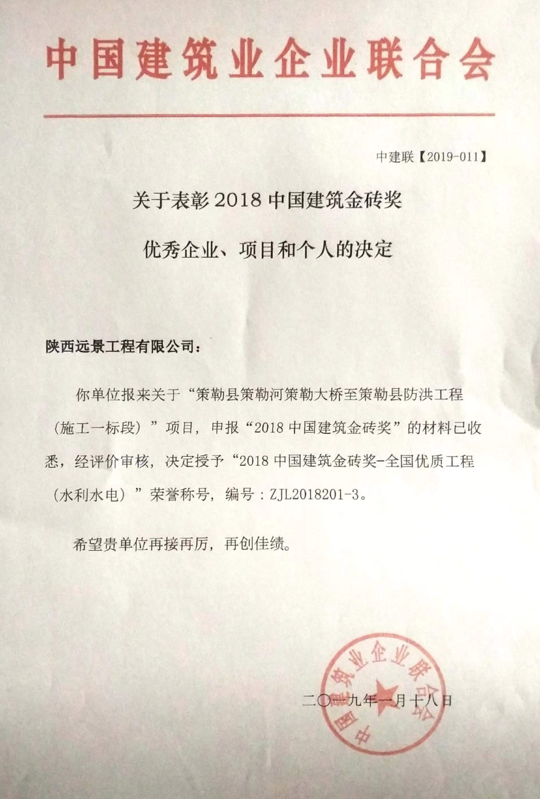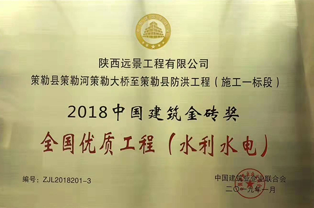 近期,中国建筑业企业联合会在网上公布了“2018中国建筑金奖”全国优质工程(水利水电)的获奖通知,由我公司承建的策勒县策勒河策勒大桥至策勒县防洪工程(施工一标段)喜获“2018中国建筑金奖”的殊荣,并颁发了荣誉证书及奖牌。